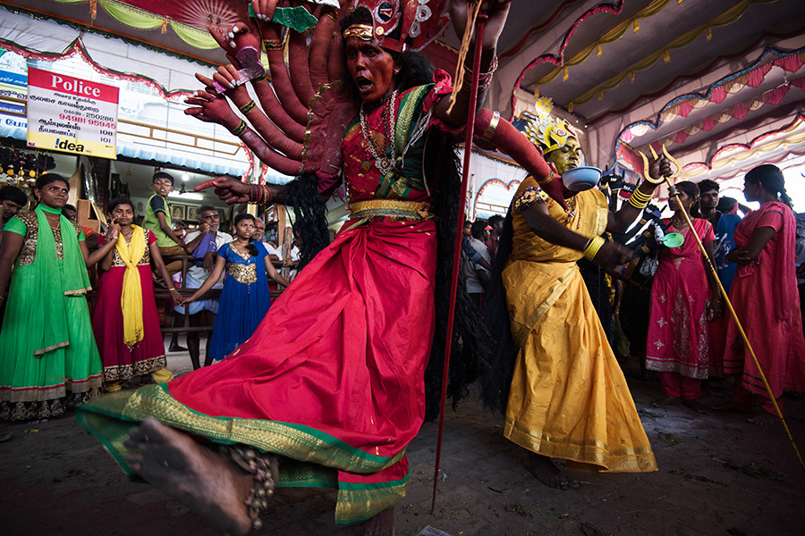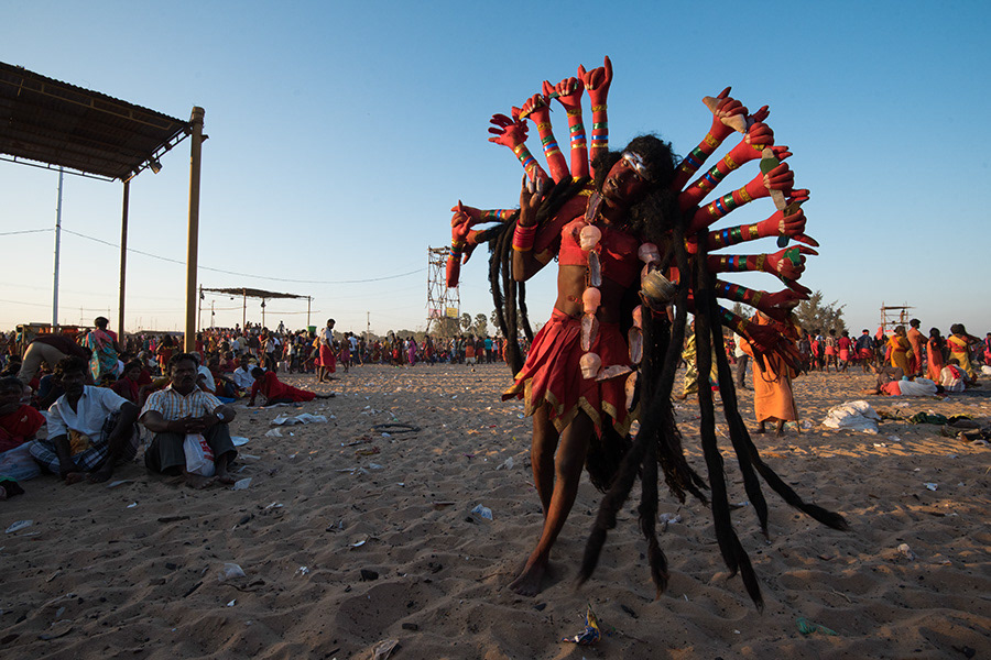 Kulasekarapattinam, is a coastal village of Tuticorn district in TamilNadu. It is about 20km from Thiruchendur and attracts over million people every year during Dasara. Kulasai Mutharamman Devi Temple is an ancient temple of about 300 years old was erected in this port city during the reign of King Maravarman Kulasekaran, it is believed the goddesses guards the Village and it’s people and will help her devotees during their hardship. The Dasara festival celebrated during the Avani month is the most auspicious at the Muthumariamman temple. It is a 12 day celebration in contrary to the 9 days celebrated elsewhere. Goddess Mutharamman bejeweled in grandeur is taken in procession on these days, in different disguise. Following an age-old tradition, devotees vow to beg for alms, disguised in various celestial forms such as Goddess Kali, Kings, monkeys, beggars etc. The money collected is offered to Goddess Mutharamman. The devotees observe the vridham for 41 continuous days and during the Dasara they dress like the god/goddess. They would maintain purity in all levels - body, mind and soul. People who portrait “Goddess KALI” tend to be more cautious than the others, as people approach them for blessings. During the last 10 days people in troupes dressed up like their favorite God or Goddess travel to surrounding villages and perform different acts and collect donations which will also be offered in the temple. The last day of the festival depicts the epic story of Magisasura Mardini [Goddess] riding a lion and slaying Magisasura on the shores of Kulasekarapattinam at midnight. This is known as “Soorasamharam”. This will be followed by dancing and burning of crackers. This is the culmination of the festivity called Vijayadashami, symbolizes dharma uprooting adharma (good over evil). Devotees suffering from small pox, chicken pox, and eye problems will be delivered from their pain, if they visit this temple.