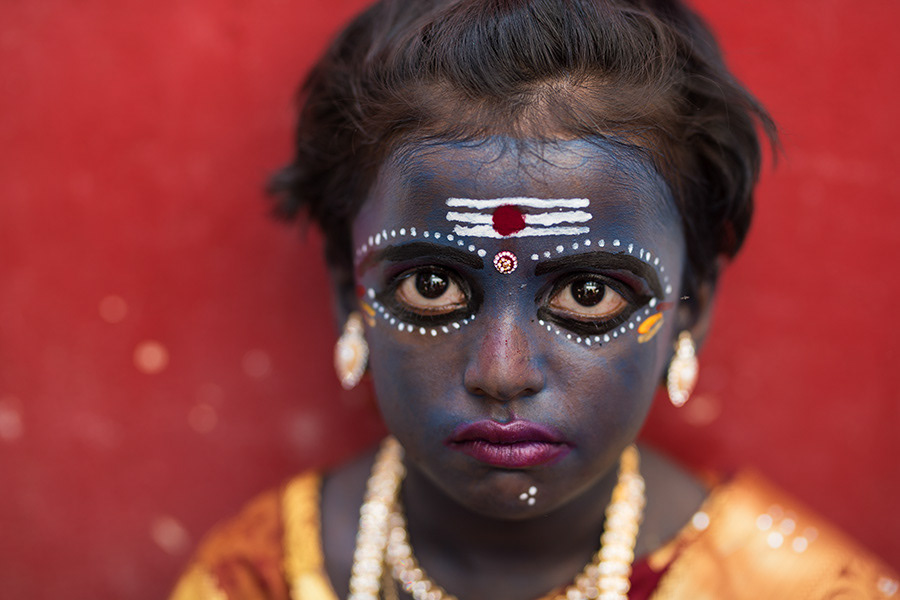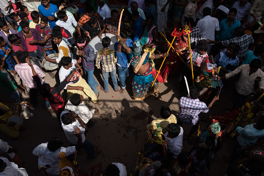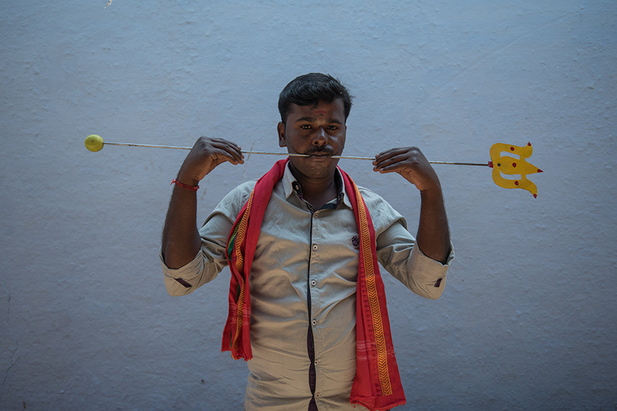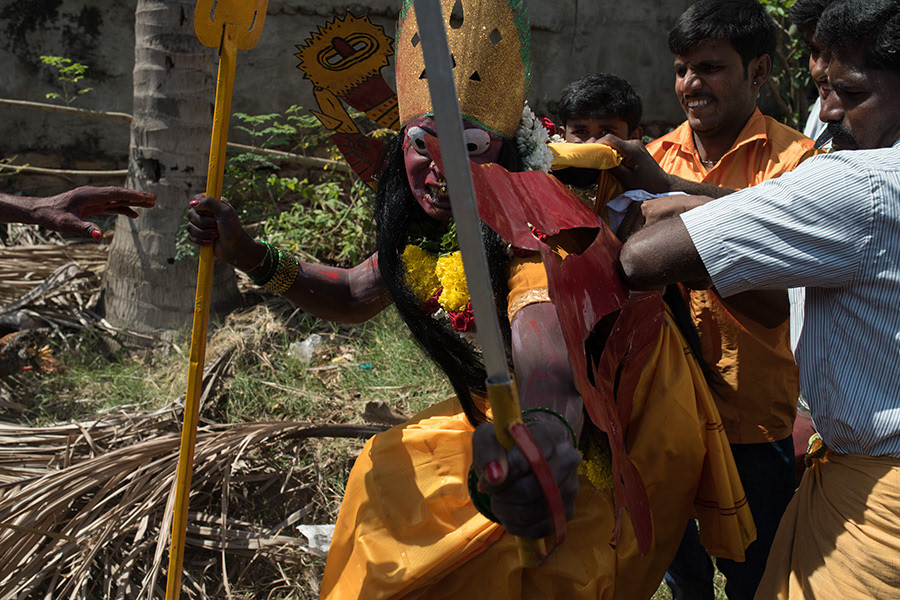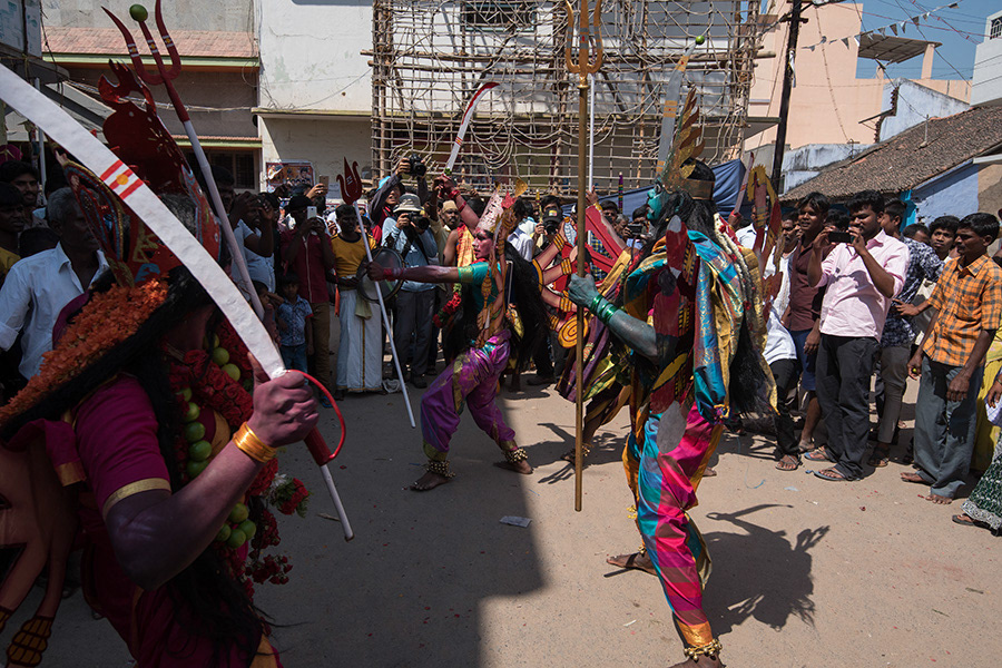 Sivaratri celebrates the convergence of Siva and Shakti. The “Mayana Soora Thiruvizha” is a festival dedicated to Angalamman (a fierce guardian deity worshipped widely in Southern India) and is celebrated in the small village of Kaveripattinam, the day after Mahasivarathiri (the great night of Lord Siva). Kaveripattinam is a panchayat town in Krishnagiri district in the Indian state of Tamil Nadu. On this day tens of thousands of devotees can be seen at the temple. The festival stands out because of “Kaliakam”, personification of Goddess Kali. This transformation of kids, men and women is done by painting their faces and adorning attire like Goddess kali. Once they are ready, they hide their faces till they reach the temple and worship the Goddess. There are others who express their devotion by having various parts of them pierced by metal spear, knife or hooks that are used to dangle them. They parade around the village till evening.