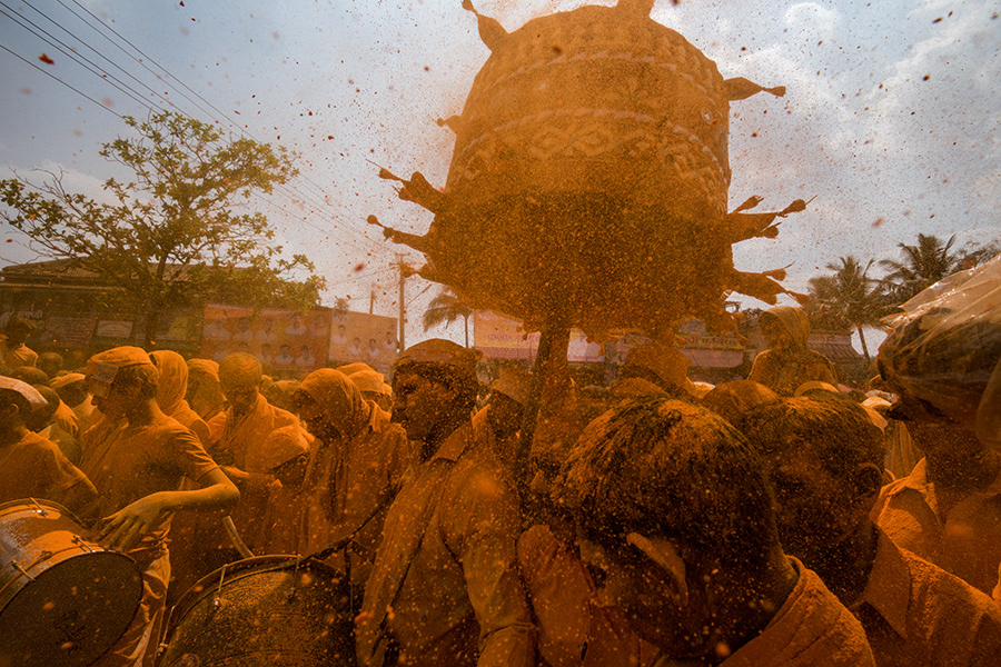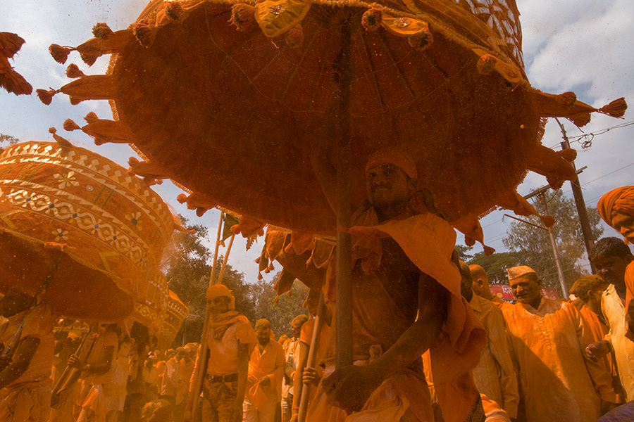 Shri Vittal Birdev Annual Yatra is observed in at Pattan Kodoli village in Hatkangale Taluka near Kolhapur. It is the annual Yatra of Vitthal who is a reincarnation of Lord Vishnu and Birdev who is a reincarnation of Mahadev. The annual fair and festival attracts thousands of devotees to Pattan Kodoli village. Birdev is the family deity of the Shepherd community from Maharashtra, Karnataka, Goa and Andhra Pradesh. Pattan Kodoli is 17km from Kolhapur. It is situated near Panchganga River. This is a unique town where you can get a glimpse of both modernity and heritage. A very important ceremony of this fare is the predictions by Shree Kheloba Rajabhau Waghmode, from Ahjangoau, a village in Solhapur District. He is considered as the messenger of god. Many start their journey days or weeks in advance by foot to reach the temple from their village in time for the Yatra. This year 2016, Baba started his journey on the 7th October and reached the temple on the 17th October. And throughout the festival he sits under a big banyan tree in a small mandap for the devotees to get his blessings. This year festival is celebrated from 17th to 24th October, 20th being the most important day. On this day Baba predicts the future of climate, crops, business and health for the coming year which will benefit the farmers immensely. Lakhs of people throng to the village on this day. The streets of the village are filled with food, entertainment and local handicrafts stalls. The festival is celebrated with bhandara. It is yellow powder, looks very similar to turmeric, but it is different. It has no smell and it is believed to have medicinal properties. The Shepherd community offer bhandara mixed with dry coconut pieces to god. It is consecrated by showering the God’s idol. The devotees collect the bhandara from the God’s feet and take it to their home. They use it on auspicious occasions and to cure any illness. Along with bhandara they also offer goat’s hair to the god. This place is famous for the blankets made of goat hair which are used by the Sheppard’s. On the day of the prediction, thousands of devotees gather in an open area in front of the banyan tree to watch the rituals. Throughout the day you can see many people gather in small groups and sing bhajans and folk songs. The devotees also shower bhandara on everything they like or worship. During the peak of the procession your will be mesmerized and lost in the moment. In the blink of an eye everything turns to yellow. The main ceremony takes places between 1pm to 5pm. During this time you hardly have any space to move around. Like on Holi, bhandara is applied on everyone and from far the whole place looks like a golden blanket. Devotees bring huge umbrellas (different model to our usual one) which are traditionally decorated and go to the temple with a band of drummers. After the darshan in the temple, they march to the open area where the celebration takes place. They play the drums, spin the huge umbrellas, sing folk songs, dance and do acrobatics. At around 3, Baba emerges from the mandap. After a few rituals, the holy sword is handed to him. It is believed after this, God descends into him. He performs with the sword which mesmerizes his devotees. Then the entire gathering proceeds into the temple. Here, he gives his prediction and people believe that it’s God speaking to them. He speaks in a distinct dialect of kannada, which is understood by a very few people. His message is translated and the priest shares it. This tradition is being followed by hundreds of years, much older than our weather satellites. As per local people 90% of his predictions come true every time